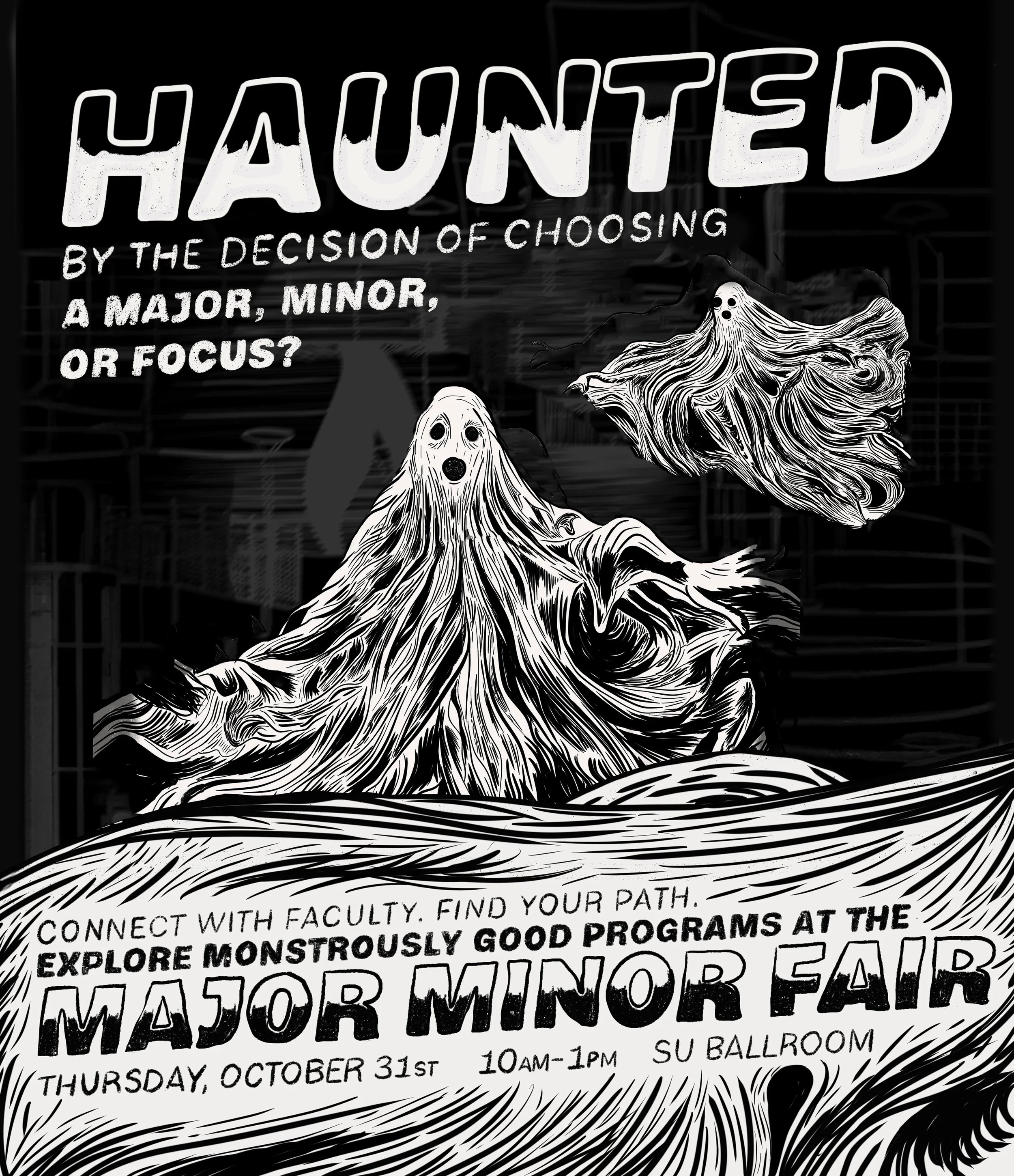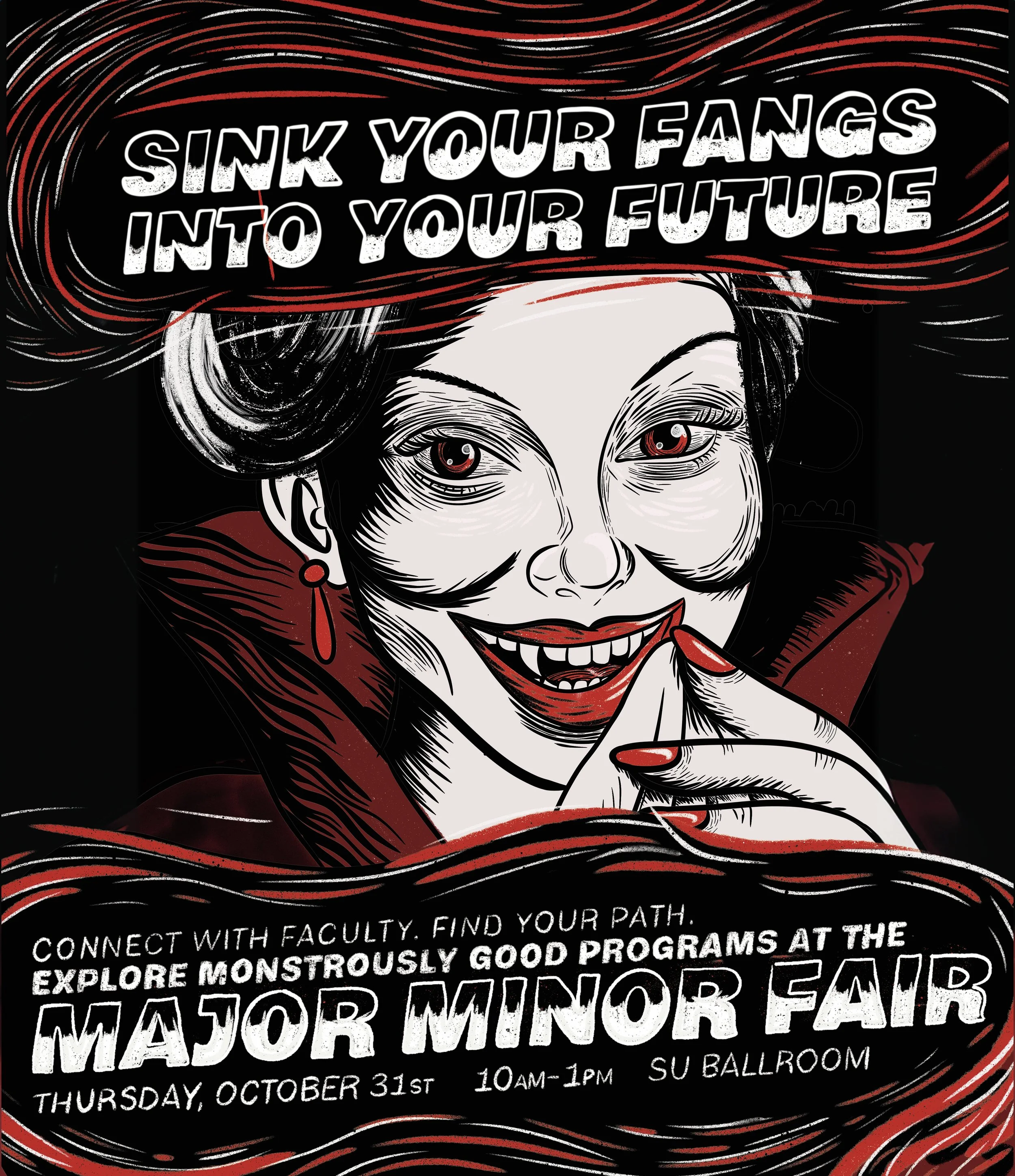 The fair took place on Halloween, so we decided it would be appropriate to base the theme on that. I landed on "Explore Monstrously Good Programs," and went with different well-known Halloween motifs (skeletons, vampires, ghosts, zombies) for flyers.